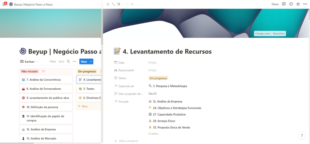 Você pode definir datas na aba tabela e então, vsualizar todo o processo na aba de timeline (linha do tempo). Se quiser, também pode mover as atividades para “em progresso” e “realizado”, na visão inicial de kanban.
